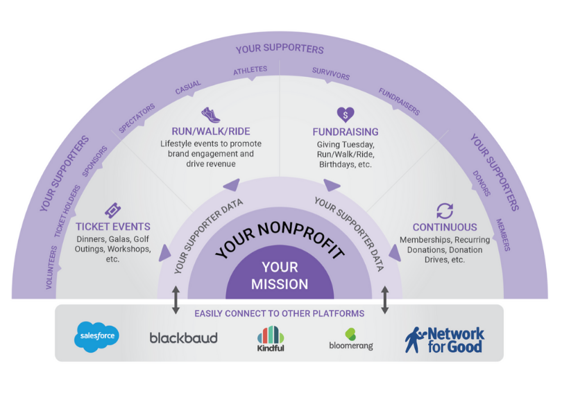 Easy-to-use and self-serve platform. Save time by creating DIY fundraising campaigns, ticket events, donation websites and forms, and run/walk/ride events in minutes.