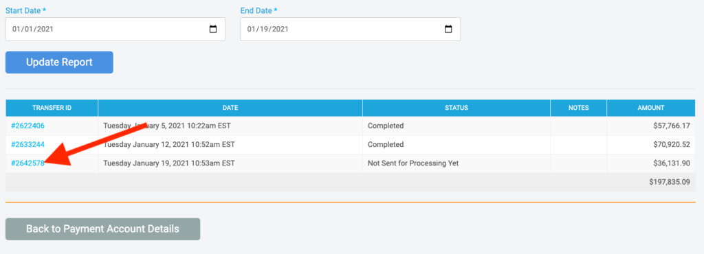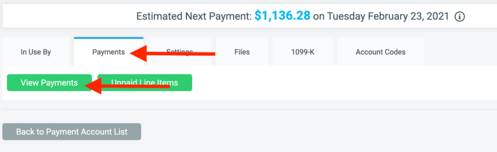 You can view this report when you navigate to your Payment Account page. Click on the Payments Tab. Then click View Payments.