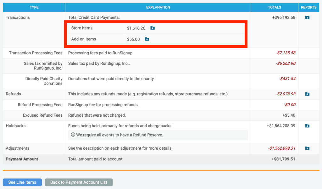 We’ve added two new line items to the payment account report’s funds transfer reconciliation report. There are now two breakdown items under transactions that allow you to export a report of add-ons and a report of store items across all of your run, walk and ride events per funds transfer.