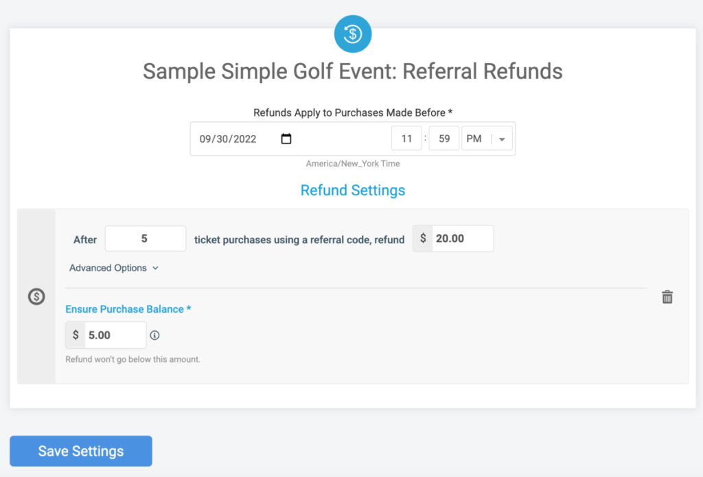 A referral is when an event attendee recruits a friend or family member to join your event with them. When you enable referrals on GiveSignup, each purchaser will get a unique referrer link that they can share with their network. When someone makes a purchase from that link, the original referrer will get credit for the referral. You can take it a step further with referral rewards and enable the system to automatically give the referrer a refund when they refer a certain number of purchasers. For example, a referrer who refers 5 golf sign ups gets a $20 refund!