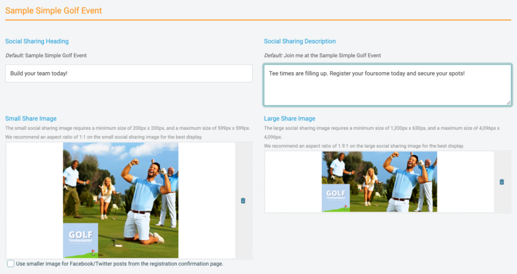 - Add a custom image and text to display when sharing. To get you started, your event logo and default text will be included when supporters share your event. But you can do more! Take advantage of our Social Sharing Message settings to add compelling photographs and action-focused copy that speaks to your social media audiences.