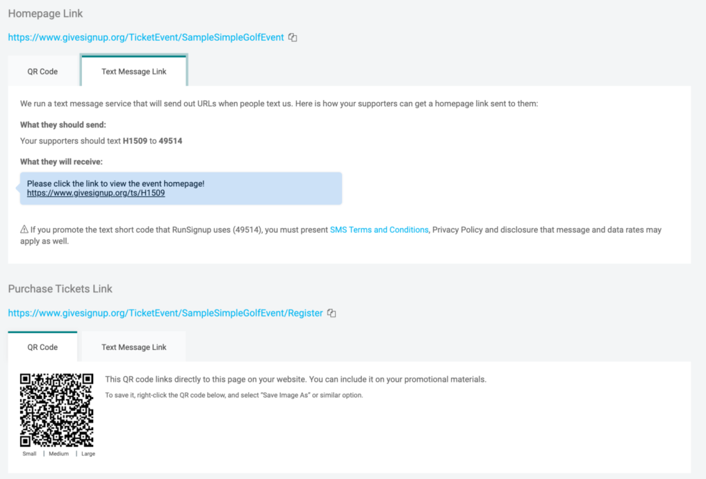 Every event on GiveSignup has a set of QR codes created to link potential attendees to your event website. Even more fun? Supporters can request a link for your event website to be sent via a designated text messaging short code – no URL’s to remember or type in. For example, text H1509 to 49514 to get a link to an example Golf Event!