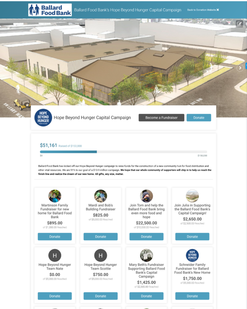 Ballard Food Bank is in the midst of a crucial $13.9 million Hope Beyond Hunger capital campaign to move them into their own building. As they close in on their goal (they are 91% of the way there!), and moved into the Community Phase of the campaign, they have used a few GiveSignup tools to support their efforts.